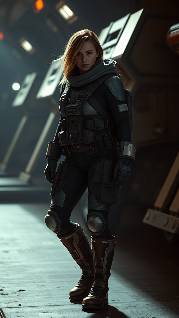 Female x-wing pilot in a sleek, futuristic space suit with sturdy boots, enveloped in cinematic lighting. The scene exudes an epic fantasy aura, captured with hyper-realistic detail and a warcore aesthetic. The grainy texture enhances the graphic and harsh look of her determined expression. The setting is ultra-high detail, at 8k resolution and in a 16:9 aspect ratio, blending elements of realism with a touch of creative flair.