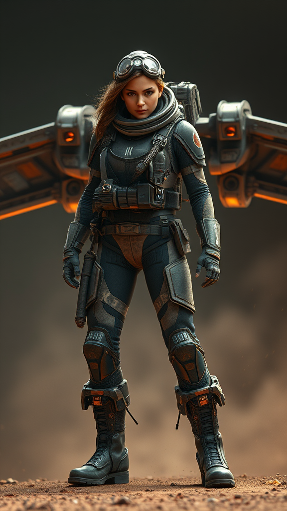 Female x-wing pilot in a sleek space suit featuring rugged boots, blending futuristic elements with epic fantasy aesthetics. Character design showcases cinematic lighting highlighting her intense, gritty expression. Hyper-realistic details combine with a warcore style, set against a grainy, graphic backdrop. The harsh features of her suit are rendered in 8k resolution, capturing every intricate component of her gear. The setting conveys a sense of tension and readiness for battle, emphasizing her determined and fearless demeanor.