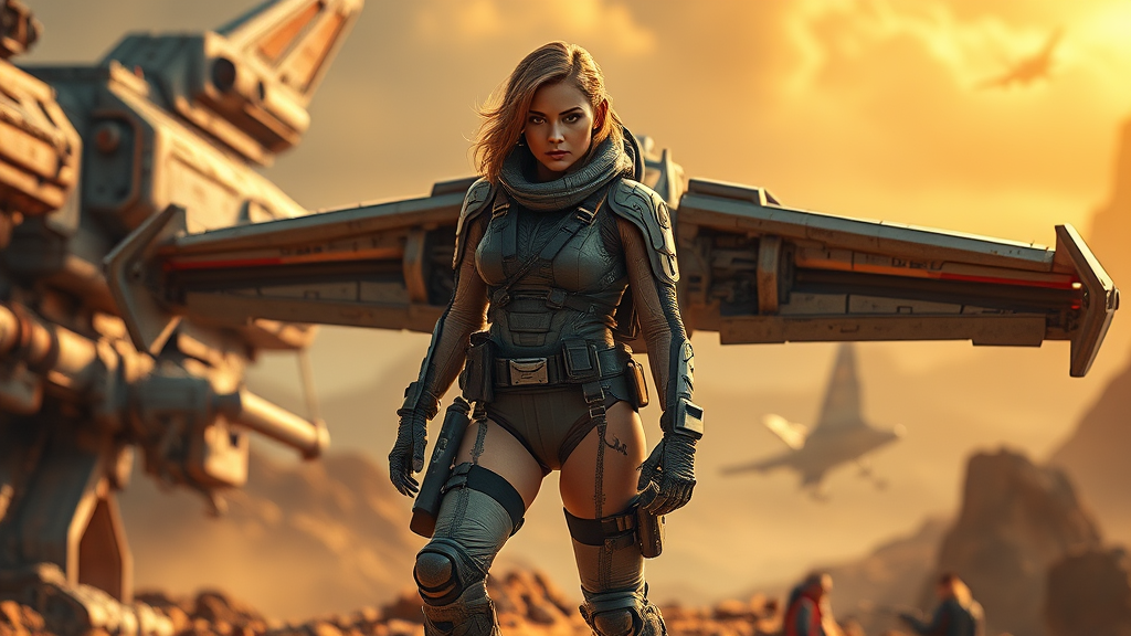 Female X-wing pilot wearing a sleek, futuristic space suit with rugged boots, set in an epic fantasy universe. The character is captured with hyper-realistic detail under cinematic lighting, highlighting her fierce and determined expression. The scene is infused with a warcore aesthetic, featuring grainy textures and graphic elements that emphasize her harsh, battle-hardened appearance. The environment is a blend of high-tech machinery and otherworldly landscapes, rendered in stunning 8K resolution for maximum detail and immersion.