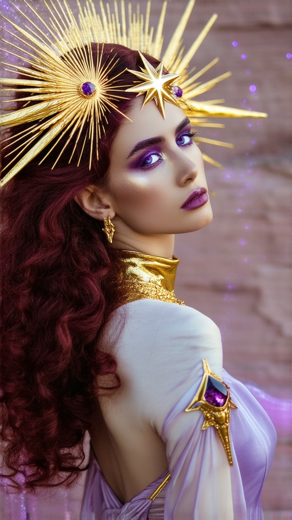 feminine female, young woman. Queen. Sci-Fi, futuristic superhero. Otherworldly, ethereal, magic, healer. Tall, statuesque, strong, fit. Shoulder length loose curls, swept back and side parted. Shiny burnt maroon colored hair, a golden star like headdress with amethyst gems sits on the right side of her head, spiraling up from her ear. Beautiful, serene face with lilac colored eyes, long lashes, and make-up in various shades of magenta and lavender. A metallic gold collar with an amethyst gem sits on her neck. She wears a metallic gold minidress, scooped out at the shoulders. The bottom half is tiered, with a side split for one leg to show. A belt of gold with a glowing amethyst at the center signifies her power as a healer and telepath. Metallic gold arm length gloves to match her dress. On her feet, metallic gold gladiator sandals with high heels, the straps reaching up to just below the knees. The outfit is completed by a short diaphanous cape in purple and gold, the purple at the top half, the gold on the bottom of the cape. The collar of the cape is lined by white faux fur, and hooks to the dress with a golden brooch with amethyst gems on both sides. Full body pose. Her aura is golden light, signifying her alignment with goodness and light.