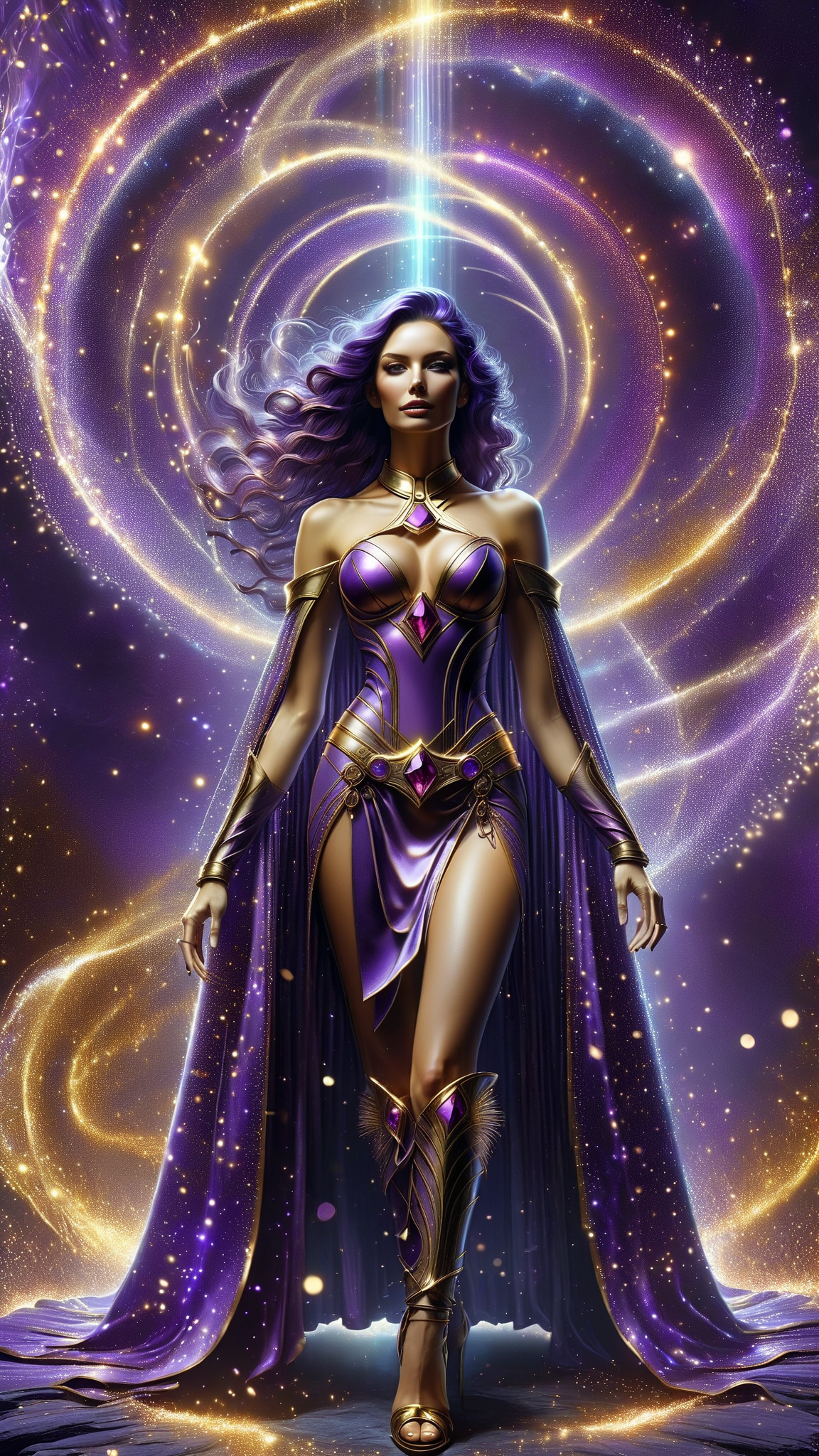 feminine female, young woman. Queen. Sci-Fi, Otherworldly, ethereal, magic, healer, telepath. Tall, statuesque, strong, fit. Shoulder length loose curls, swept back and side parted. Shiny burnt maroon colored hair, a golden star like headdress with amethyst gems sits on the right side of her head, spiraling up from her ear. Beautiful, serene face with lilac colored eyes, long lashes, and make-up in various shades of magenta and lavender. A metallic gold collar with an amethyst gem sits on her neck. She wears a metallic gold minidress, scooped out at the shoulders. The bottom half is tiered, with a side split for one leg to show. A belt of gold with a glowing amethyst at the center signifies her power as a healer and telepath. Metallic gold arm length gloves to match her dress. On her feet, metallic gold gladiator sandals with high heels, the straps reaching up to just below the knees. The outfit is completed by a short diaphanous cape in purple and gold, the purple at the top half, the gold on the bottom of the cape. The collar of the cape is lined by white faux fur, and hooks to the dress with a golden brooch with amethyst gems on both sides. Full body pose. Her aura is golden light, signifying her alignment with goodness and light.