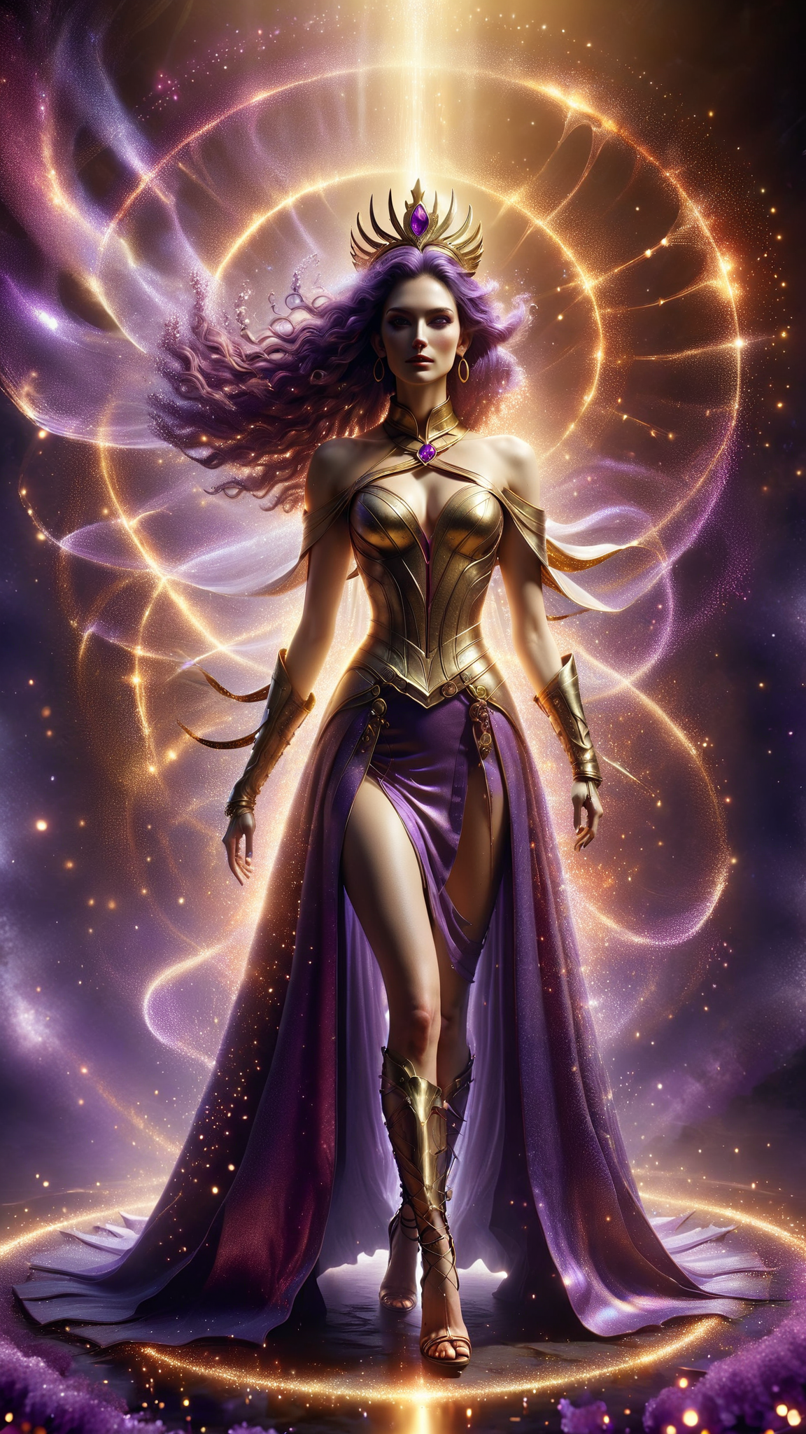 feminine female, young woman. Queen. Sci-Fi, Otherworldly, ethereal, magic, healer, telepath. Tall, statuesque, strong, fit. Shoulder length loose curls, swept back and side parted. Shiny burnt maroon colored hair, a golden star like headdress with amethyst gems sits on the right side of her head, spiraling up from her ear. Beautiful, serene face with lilac colored eyes, long lashes, and make-up in various shades of magenta and lavender. A metallic gold collar with an amethyst gem sits on her neck. She wears a metallic gold minidress, scooped out at the shoulders. The bottom half is tiered, with a side split for one leg to show. A belt of gold with a glowing amethyst at the center signifies her power as a healer and telepath. Metallic gold arm length gloves to match her dress. On her feet, metallic gold gladiator sandals with high heels, the straps reaching up to just below the knees. The outfit is completed by a short diaphanous cape in purple and gold, the purple at the top half, the gold on the bottom of the cape. The collar of the cape is lined by white faux fur, and hooks to the dress with a golden brooch with amethyst gems on both sides. Full body pose. Her aura is golden light, signifying her alignment with goodness and light.