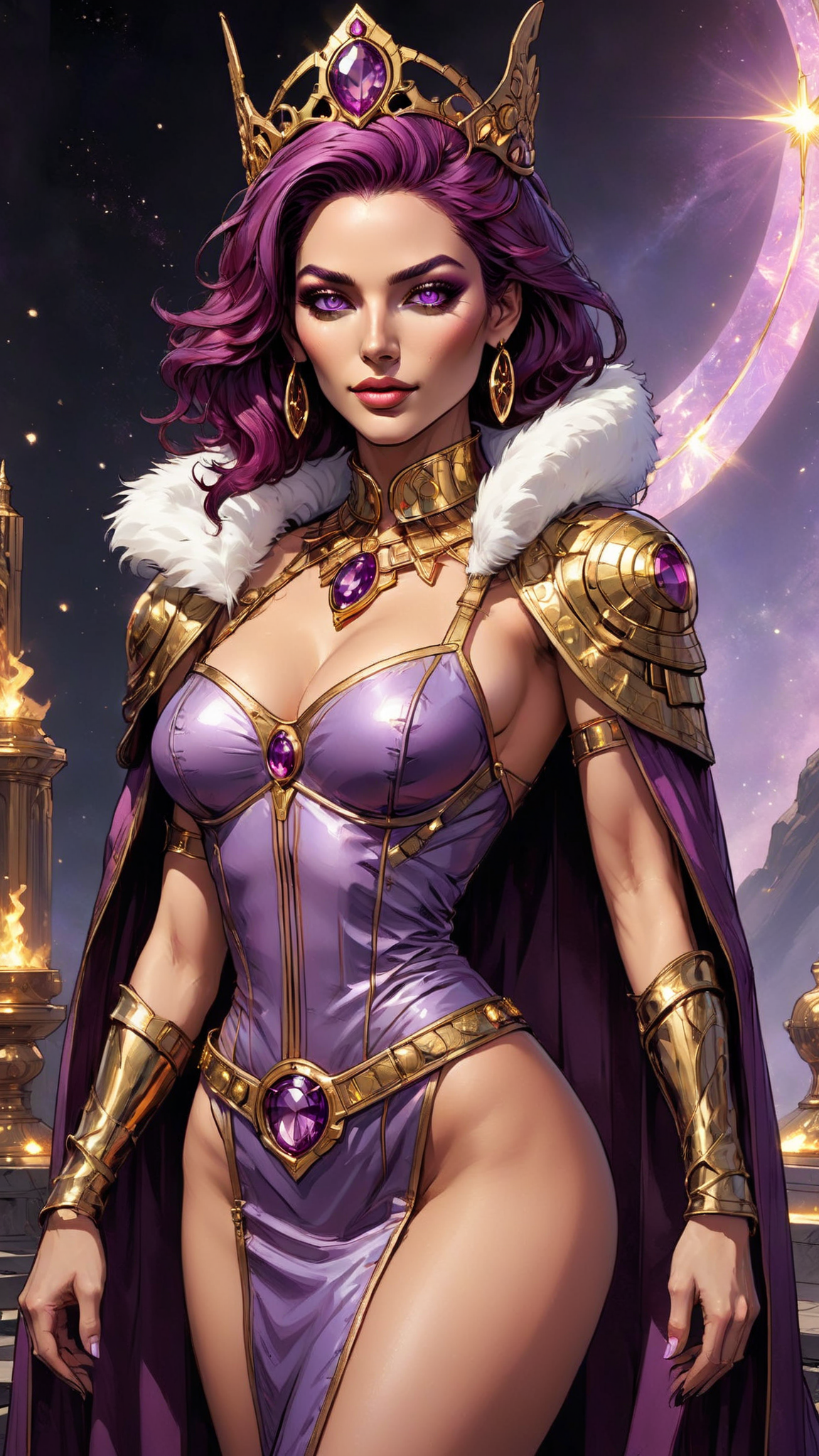feminine female, young woman. Queen. Sci-Fi, Otherworldly, ethereal, magic, healer, telepath. Tall, statuesque, strong, fit. Shoulder length loose curls, swept back and side parted. Shiny burnt maroon colored hair, a golden star like headdress with amethyst gems sits on the right side of her head, spiraling up from her ear. Beautiful, serene face with lilac colored eyes, long lashes, and make-up in various shades of magenta and lavender. A metallic gold collar with an amethyst gem sits on her neck. She wears a metallic gold minidress, scooped out at the shoulders. The bottom half is tiered, with a side split for one leg to show. A belt of gold with a glowing amethyst at the center signifies her power as a healer and telepath. Metallic gold arm length gloves to match her dress. On her feet, metallic gold gladiator sandals with high heels, the straps reaching up to just below the knees. The outfit is completed by a short diaphanous cape in purple and gold, the purple at the top half, the gold on the bottom of the cape. The collar of the cape is lined by white faux fur, and hooks to the dress with a golden brooch with amethyst gems on both sides. Full body pose. Her aura is golden light, signifying her alignment with goodness and light.