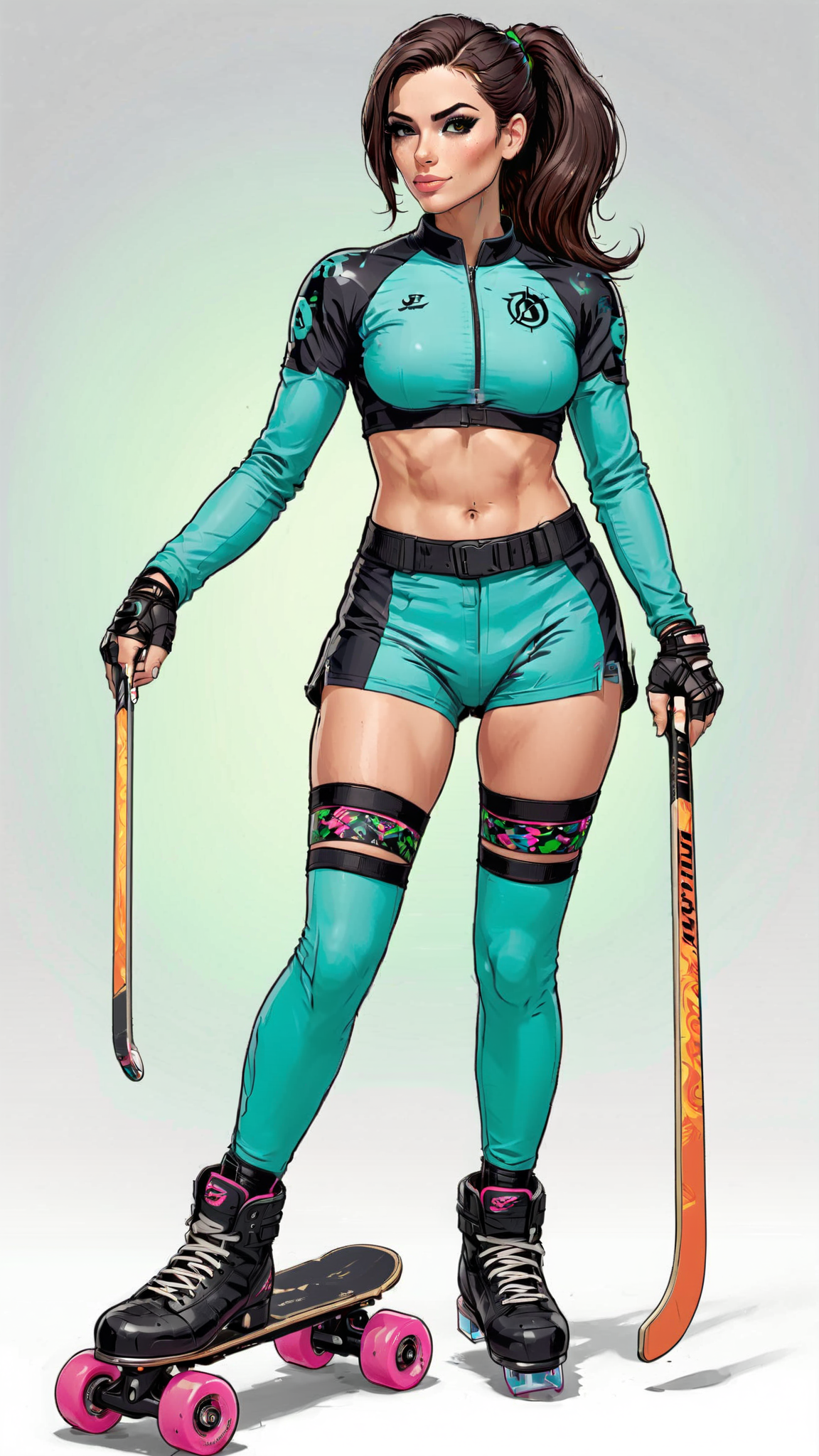 feminine woman, Caucasian female. Sports enthusiasts, especially Roller Derby and Hockey. Athlete. Tall, strong, fit, agile, dexterous. Handsome woman. Long dark brown hair, pulled back into a high ponytail, Bangs with a middle part. She DOES NOT WEAR MAKEUP, only a little cherry ChapStick. Light brown eyes, usually hidden behind green goggles/solar Shields. Long sleeve spandex sport shirt with a flaming comet symbol on the front. The shirt is dominantly bright green with black cut-out patterns. Black, small shoulder pads and elbow pads for sports protection. Black sports tights, predominantly green with black cut-out patterns. Black knee pads, black shin-guards. Black and green roller blades on her feet, and she's usually carrying a hockey stick as her weapon of choice. Can often be seen chewing bubble gum, blowing bubbles and cracking her gum to annoy people. Full body pose, probably roller blading.