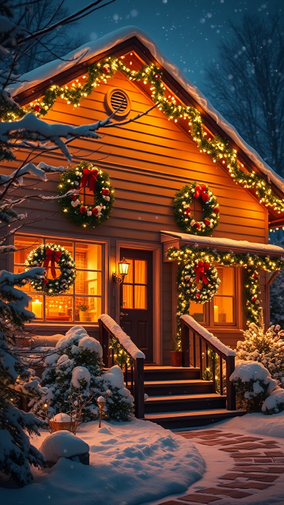 Festive holiday home adorned with twinkling lights, surrounded by softly falling snow, vibrant wreaths on windows, glowing candles in the frosty night, warm golden hue illuminating the cozy interior, cinematic feel, HD quality.