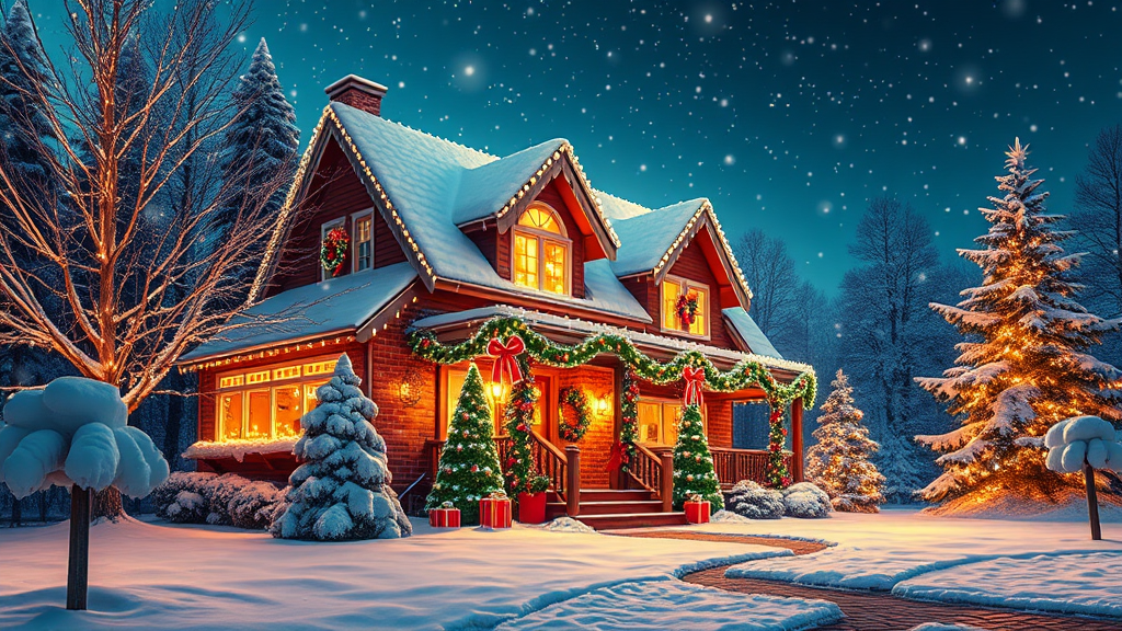 Festive holiday home with sparkling Christmas lights, surrounded by gently falling snow, vibrant decorations adorning the house, a warm golden glow emanating from the windows, snow-covered trees and a starry night sky background, immersive and high-definition visual warmth