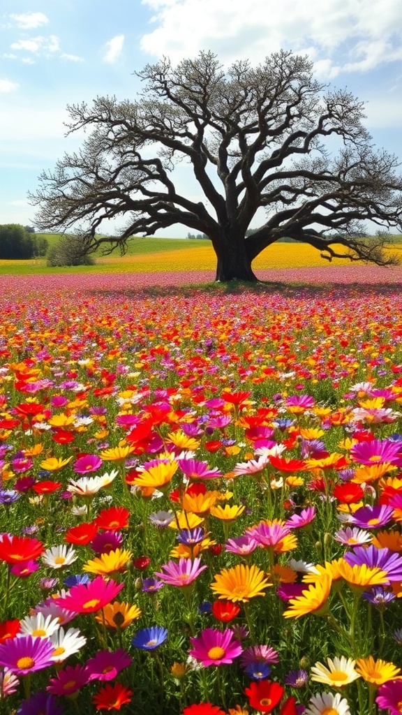 A vast field of wildflowers showcases an array of vivid colors, each bloom glowing brilliantly in the warm sunlight. Unique flowers of varying sizes and hues spread across the landscape, creating a vibrant tapestry of nature. At the heart of this floral expanse stands a majestic, ancient tree. Its sprawling branches stretch wide across the sky, casting gentle shadows over the colorful meadow below, adding a sense of timeless beauty to the idyllic scene.