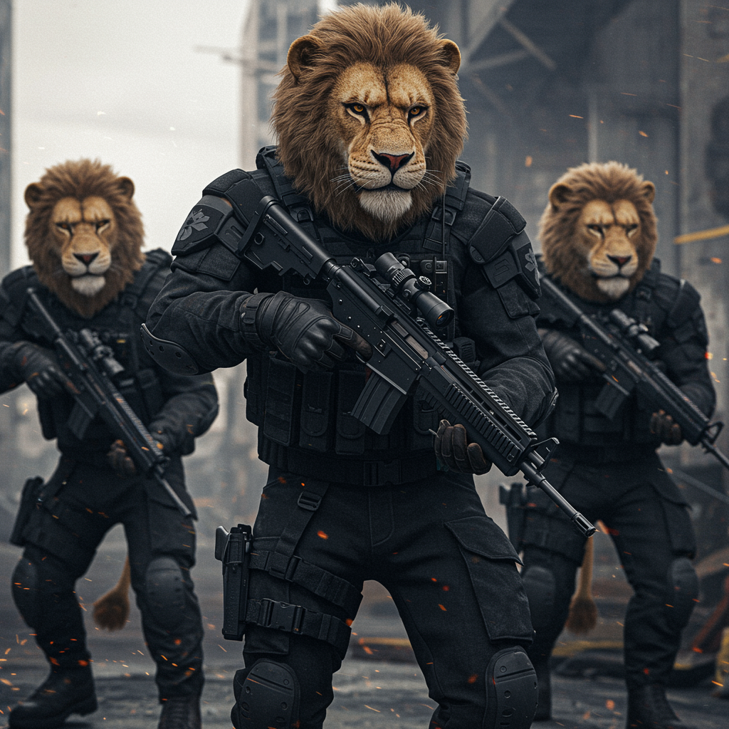 Fierce and battle-hardened lion soldiers, clad in sleek black tactical gear, wielding advanced carbine rifles, anthropomorphic and intricately detailed in ultra high definition. The scene captures their intense expressions and striking features in stunning 8k, with lifelike, maximum facial detail emphasized by dramatic cinematic lighting, set against a dynamic and action-packed environment.