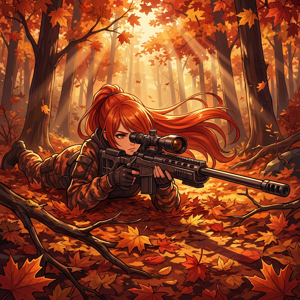 A determined female sniper with flowing red hair lies prone, aiming a high-powered rifle amidst vibrant autumn leaves. Golden sunlight filters through the trees, creating a dramatic and focused atmosphere in this anime-style digital painting.