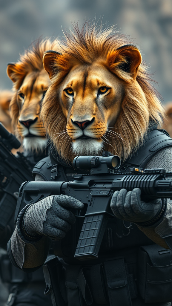 Fierce, battle-hardened lion warriors clad in sleek black ops uniforms, gripping advanced carbine rifles, showcasing anthropomorphic features, hyper-detailed with ultra HD clarity, captured in real-life intensity, each exhibiting maximum facial detail, illuminated by dramatic cinematic lighting, set within a high-stakes environment, evoking a sense of raw power and determination, all in a vertical aspect ratio with heightened realism and dynamic storytelling.