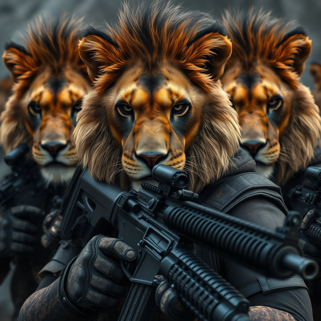 Fierce, battle-worn lion warriors clad in tactical black ops gear wielding advanced carbine rifles, showcasing human-like features with intense expressions; incredibly detailed textures with a hyper-realistic, lifelike appearance in ultra-high definition, 8k resolution; stunning facial intricacies and cinematic lighting create an epic, commanding atmosphere.