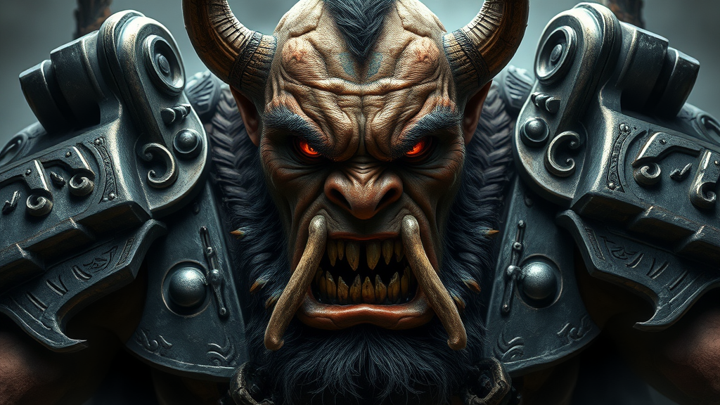 Fierce full-body portrait of a wrathful orc clad in iron armor, exuding intimidation and formidable power. The low-angle perspective enhances its menace, with a horror aesthetic rendered in high-octane detail. The orc's features are captured in smooth, sharp focus with dramatic lighting emphasizing fine details. A masterpiece inspired by the styles of Stanley Lau, Jason Chan, and Mark Hill, it boasts the quality of trending artworks on ArtStation, presented in stunning 4K resolution. This depiction includes creative elements like tribal armor engravings and glowing eyes, evoking a sense of ancient fury and supernatural energy.