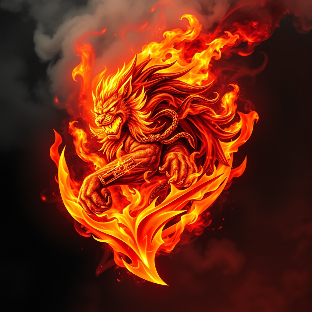 Fierce lion warrior emblem engulfed in blazing fire and swirling smoke, radiating intense fury.