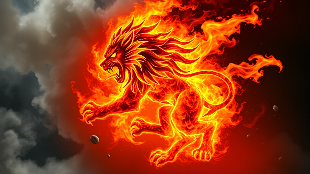 Fierce lion warrior emblem engulfed in blazing fire and swirling smoke, exuding intense fury and power.