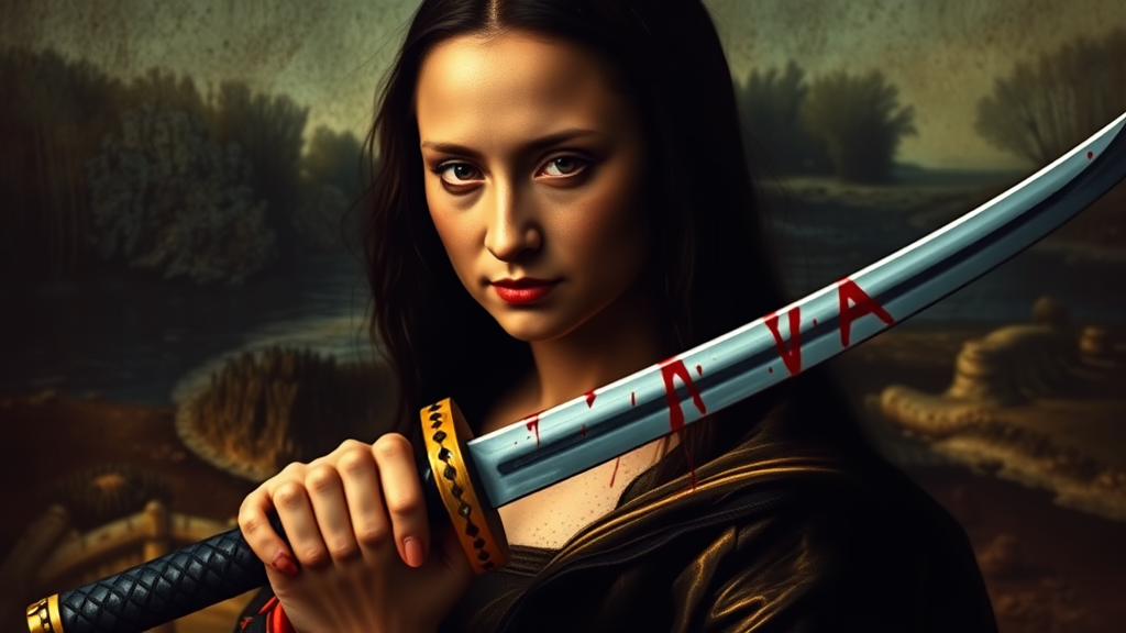 Fierce Mona Lisa envisioned by Quentin Tarantino, cinematic and hyper-realistic, intensely detailed, locking eyes with the camera, wielding a katana as her weapon of choice, splattered with blood, visually striking with a dramatic 9:16 aspect ratio, heightened tension and grit, atmospheric with stylized violence, capturing the essence of fearless elegance.