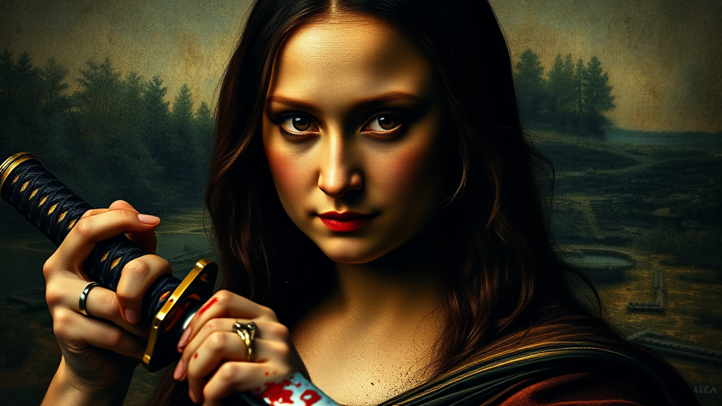 Fierce Mona Lisa envisioned by Tarantino, ultra-realistic and cinematic detail, intense gaze into the camera, wielding a katana, splattered with fresh crimson, moody atmosphere -- high-resolution portrait -- atmospheric -- gritty realism -- focus on intensity.