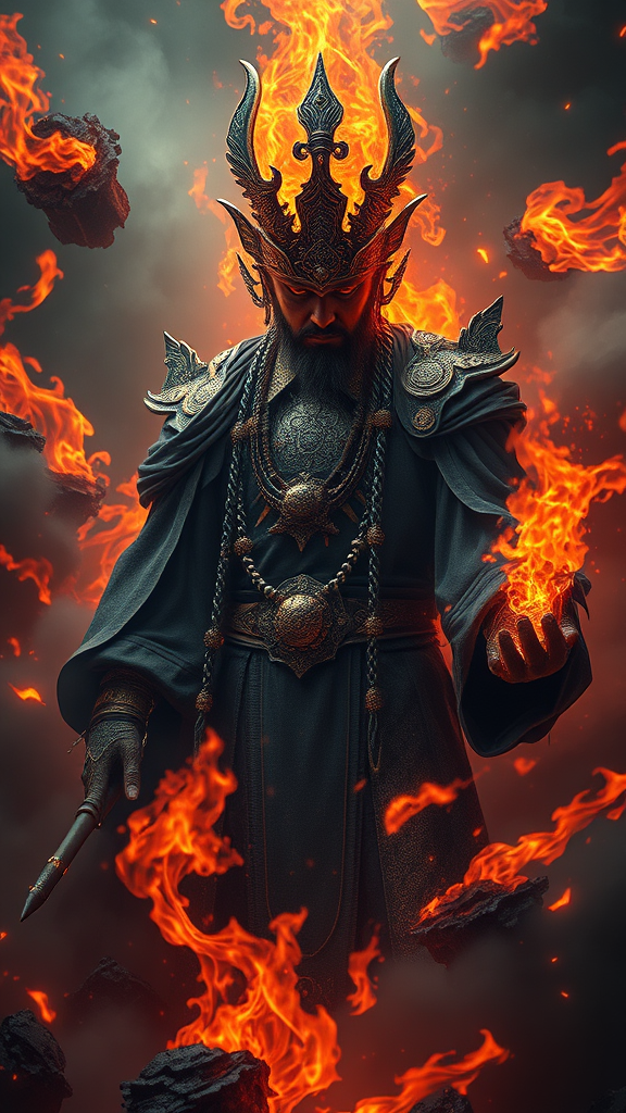 Fierce ruler master of flames amidst swirling infernos, surrounded by dense mist and atmosphere, featuring a flawless countenance, lifelike and full-figure, firmly grounded, entwined with digital circuitry, adorned in elaborate attire, fantastical and illustrative, evocative of an Artstation showcase, hyper-detailed, maximalist with complex cinematic tribal dark fantasy elements, 8k resolution Ultra-detailed Quality 3D Octane Render, photorealistic vision, razor-sharp focus, impeccable composition, dramatic shadows and lighting, perfect for wallpaper, HDR, high-definition, maintaining a stylized flair with a creative twist.