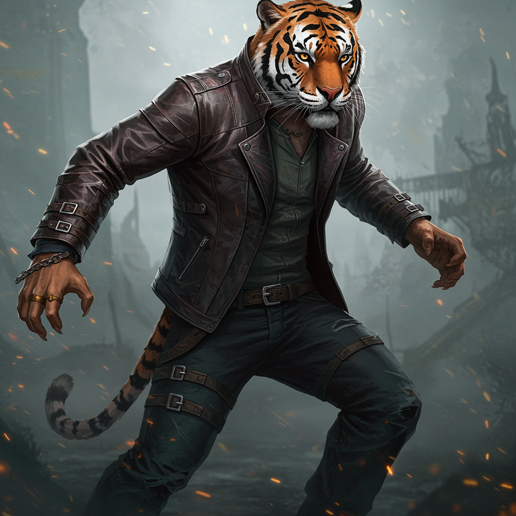Fierce tiger, rugged leather jacket, dynamic stance, influenced by Dishonored aesthetics, highly detailed full body portrayal, ultra-high definition, 8K resolution, dramatic lighting, intense gaze, background of a misty, shadowy urban landscape, saturated colors.