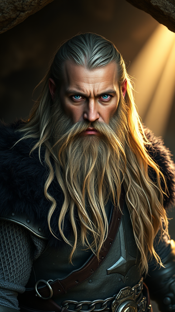 Fierce Viking warrior with striking long blonde hair and a flowing long beard, his rough and pale skin contrasting with piercing blue eyes. His symmetrical and hauntingly handsome face is marked by the battle-worn character, while maintaining an aura of rugged angelic beauty. His physique combines bulky and lean features, wrapped in battle-damaged armor, featuring intricate grey chainmail paired with elegant lamellar armor, accented by a luxurious black animal fur cloak. Illuminated by dramatic light, sun rays filter through a shadowy cave creating an intense and fantastical atmosphere reminiscent of D&D lore. Capturing a dynamic pose, this scene is full-body and realistically detailed, with soft illumination enhancing the depth of field. Blurring adds photorealism, and the cinematic quality is heightened by an 8k hyperdetailed, ultra-detailed V-ray render.