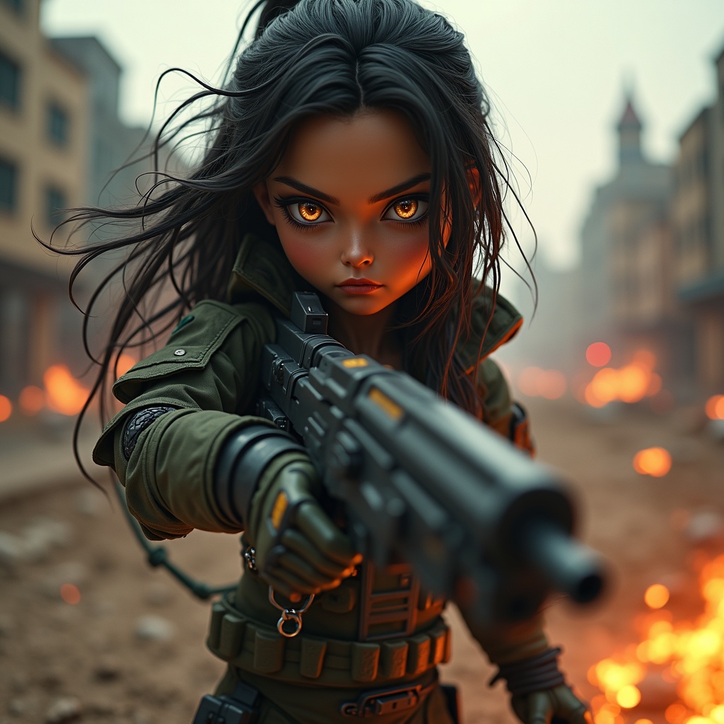 View this AI-generated image featuring fierce warrior bjddoll with an intense glare porcelain complexion clad in soldier attire her eyes shimmering with an entrancing allure cascading long and tousled hair wielding a high tech weapon embodying pure badassery amidst swirling dust in a sci fi cyberpun