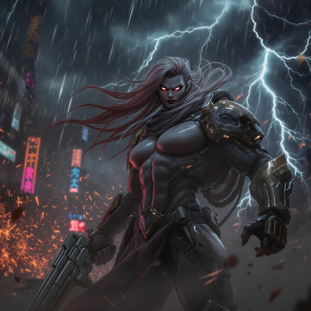 Fierce warrior bjddoll, porcelain skin, battle-hardened, intense gleaming eyes, long unruly hair, armed, formidable, swirling dust, scifi, neon cyberpunk, advanced technology, dystopian cityscape backdrop, raging storm, electric sparks, ultra-high resolution, vivid intricacies, artfully designed, artstation inspiration, dynamic composition, fluid lighting, warfare scene, stunning artistry, razor-sharp clarity.
