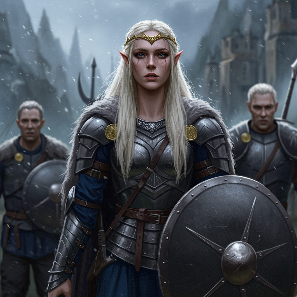Fierce warrior queen at the heart of the scene, key focal point of visual splendor, with exquisite detailing and stunning beauty, precise and intricate linework, vibrant hues capturing every nuance, evocative of Carne Griffiths' ethereal tones and Conrad Roset's fluid elegance, in a comprehensive cinematic tableau.