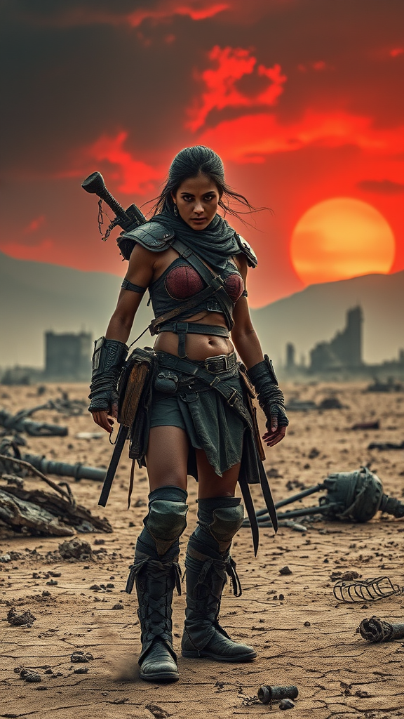 Fierce warrior woman in a barren wasteland, wearing rugged, improvised armor made from scavenged materials, standing amidst a desolate landscape with ruined structures in the background, her determined gaze focused on the horizon; the sky is a dramatic blend of crimson and ash-gray, casting an eerie glow over the scene; the ground is cracked and desolate, sparsely dotted with twisted metal remnants and scattered debris, suggesting a once-vibrant civilization now reduced to decay; the air is thick with dust, creating an atmosphere of haunting beauty and survival, highlighting her resilience and strength in this harsh post-apocalyptic world.