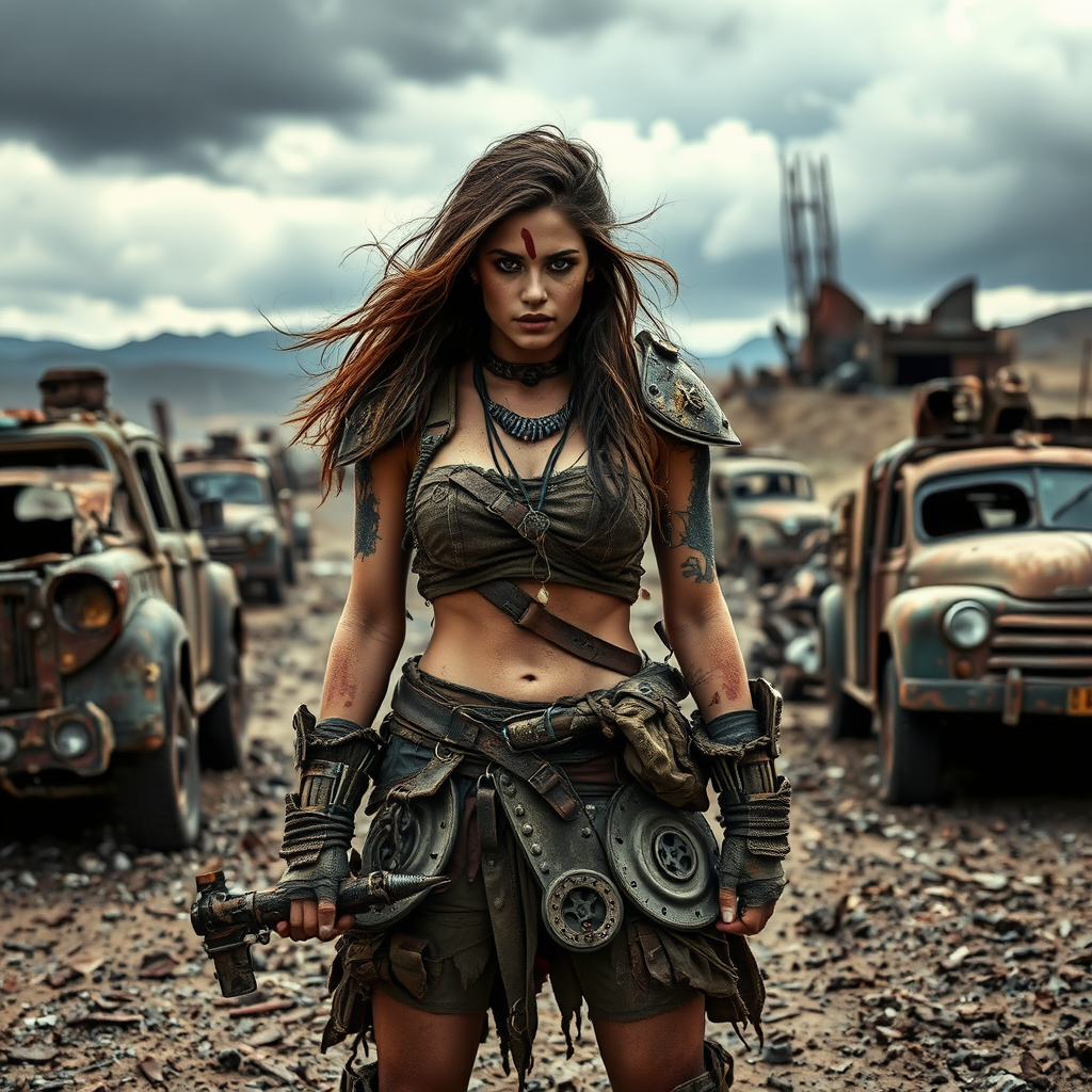 Fierce warrior woman in a rugged, post-apocalyptic wasteland, adorned with improvised armor and tattered clothing, standing confidently amidst a desolate landscape of rusted vehicles and crumbling structures, her dirt-streaked face set with determination, a makeshift weapon in hand, under a dramatic, stormy sky, capturing the essence of survival and strength in a world where chaos reigns.