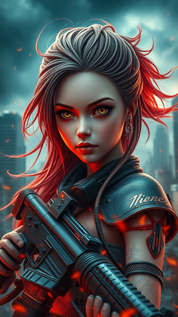 Fiery girl bjddoll, porcelain skin, fierce warrior, captivating iridescent eyes, cascading wild locks, armed and dangerous, gritty, sci-fi inspired, cyberpunk essence, advanced technology, dystopian city skyline, tempestuous weather, glowing embers, ultra-detailed 4k, vivid and intricate, expertly designed, artstation-quality, dynamic composition, fluid illumination, battle-hardened, stunning focal clarity.