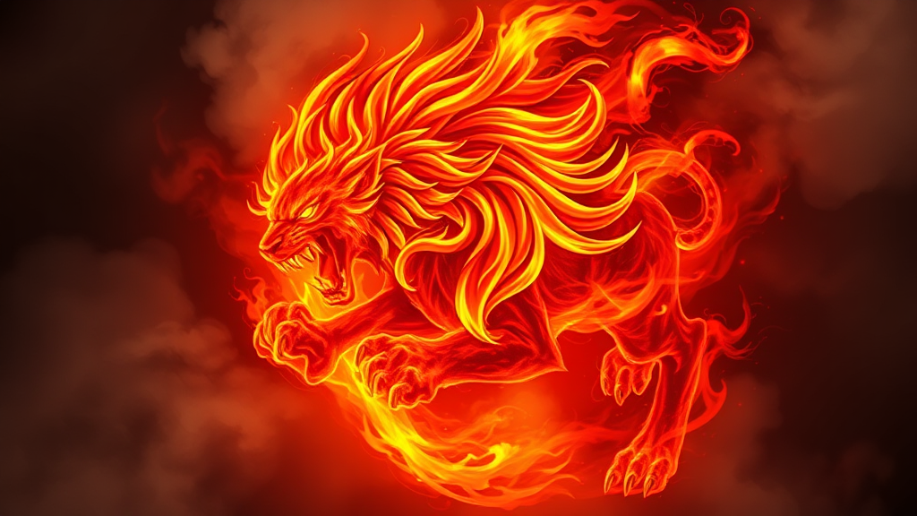 Fiery lion champion emblem, engulfed in flames and swirling smoke, exuding fierce determination and unyielding strength.