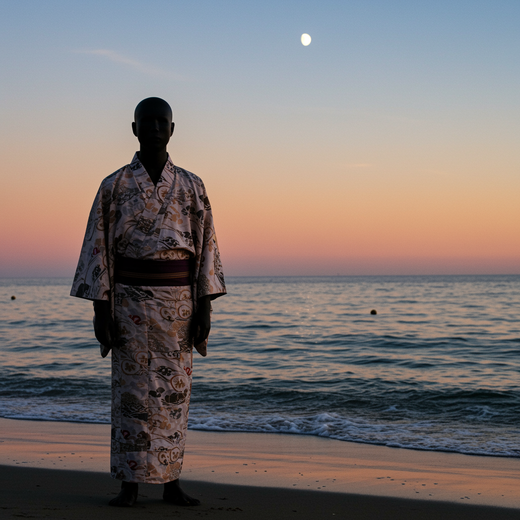 A faceless figure gazes out at us with an unseen but profoundly palpable emotional depth, standing alone on a serene, moonlit beach. Waves gently lap at the shoreline, echoing the rhythm of his silent vigil. His attire is an exquisite blend of traditional Japanese garments, their intricate patterns shifting like the tide. The setting sun casts a warm glow upon the kimono's delicate silk, creating an ethereal contrast against the encroaching twilight. Though his features are absent, his posture speaks volumes, evoking an enigmatic yet moving connection that transcends the boundaries of sight and touches the soul with a sense of longing and introspection.
