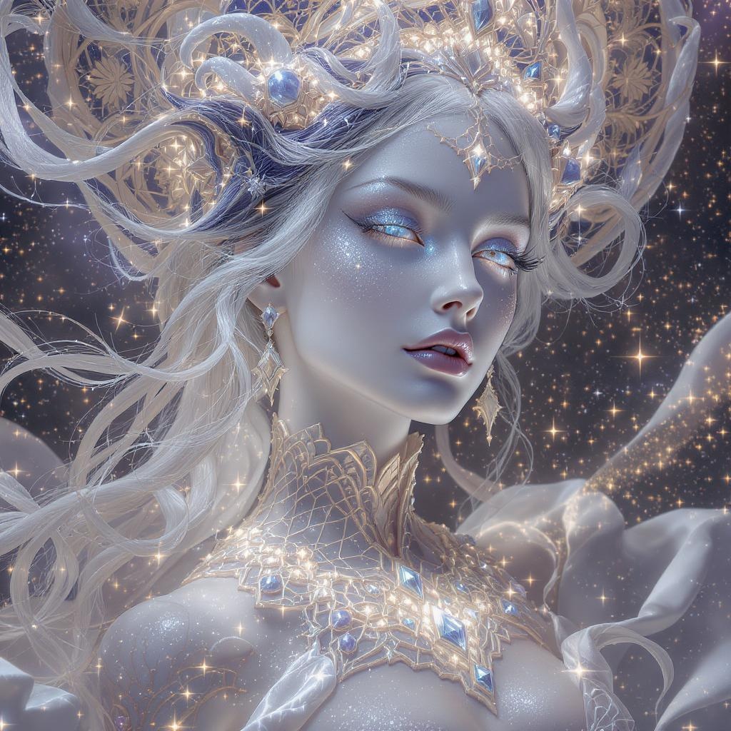 View this AI-generated image featuring a porcelain skinned figure with celestial inspired makeup stands against a backdrop of shimmering stars surrounded by a magical atmosphere with intricate hyper detailed embellishments in 4k resolution exuding an ethereal charm. Created using advanced AI technol