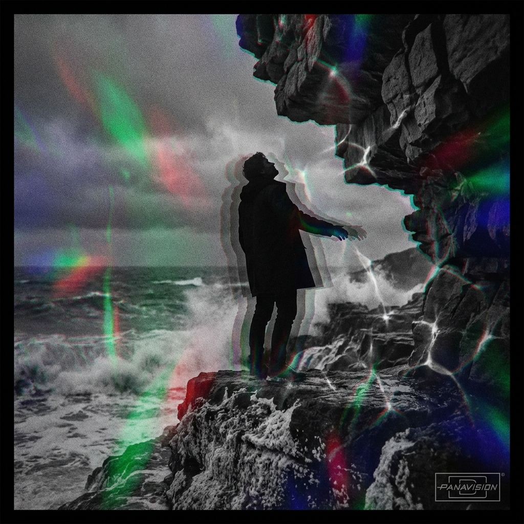 A lone figure stands silhouetted on a rugged cliff overlooking a turbulent, monochrome sea. Vibrant, refracted light streaks across the dark, dramatic landscape, creating an otherworldly and intense atmosphere.
