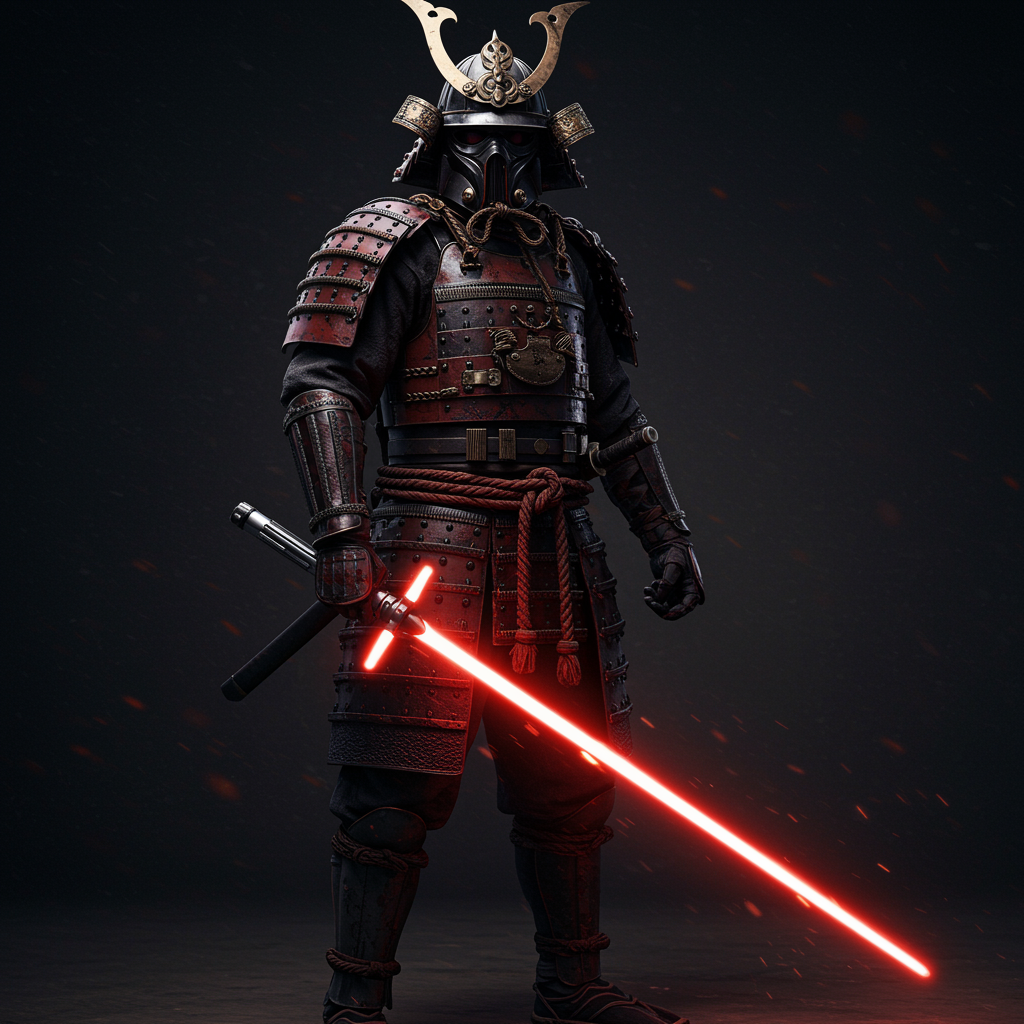A menacing figure stands in intricate samurai armor, the black and red hues weaving a tale of power and mystique. Under the cinematic lighting, the gleaming layers of armor reveal both complexity and battle-worn elegance. In his grasp, a glowing lightsaber hums with anticipation, its crimson light casting eerie shadows. The dark backdrop only intensifies the ominous presence, adding to the aura of a formidable warrior from a distant galaxy.