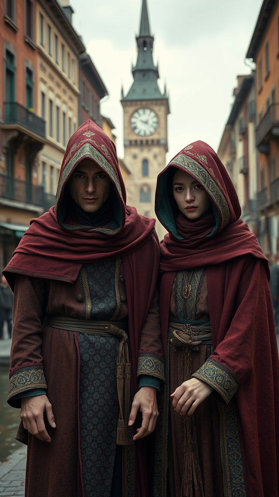 Figures clad in intricate maroon and emerald finery, resembling worn deerskin robes, with ornate cloth hats adorning their heads, rendered in photorealistic detail akin to biological wildlife photography, set amidst an Unreal Engine-generated neo-Renaissance urban dreamscape, complete with canal-lined cityscapes, clock tower silhouettes, and subtle texture mapping to evoke worn stone and worn leather, with subtle guige cords cinched around their mantles, plumage-inspired patternwork that echoes peacock blues and emerald hawks, enigmatic characters with an air of mystique, paired in quiet repose amidst sophisticated textures and muted ligneous façades.