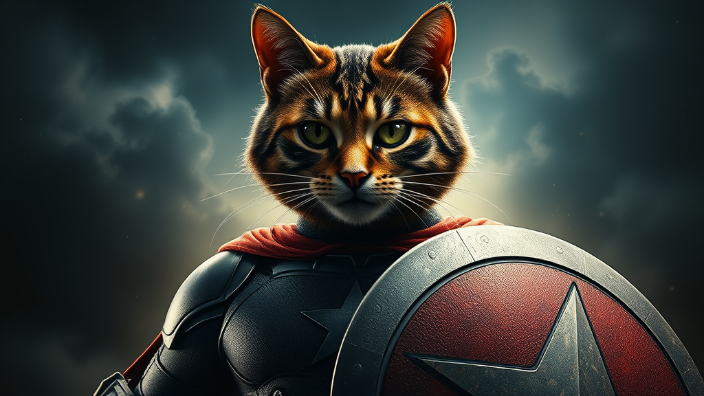 Film poster depicting a heroic cat head on an anthropomorphic humanoid body, styled in the iconic manner of a legendary superhero with a shield. Rendered in high detail and hyper-realistic style, utilizing advanced octane rendering techniques to enhance texture and depth. The composition focuses on the dynamic stance and power of a feline hero, without any human faces, people, men, or women to maintain its unique character. The overall aesthetic emphasizes grandeur and courage, set against a dramatic backdrop for an epic cinematic presentation.