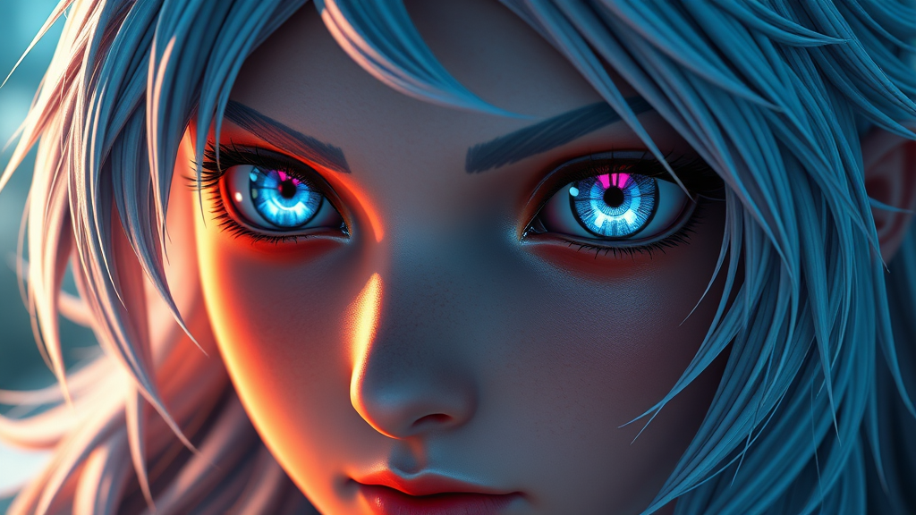 Final Fantasy inspired ultra high resolution, highly detailed 8K wallpapers, featuring physics-based rendering and cinematic lighting; vibrant colors highlighting beautiful, detailed eyes in a CGI scene; 3D character design with intricate details and a touch of creativity, ensuring flawless anatomy and proportions; capturing an awe-inspiring fantasy world without imperfections or visual distortions.