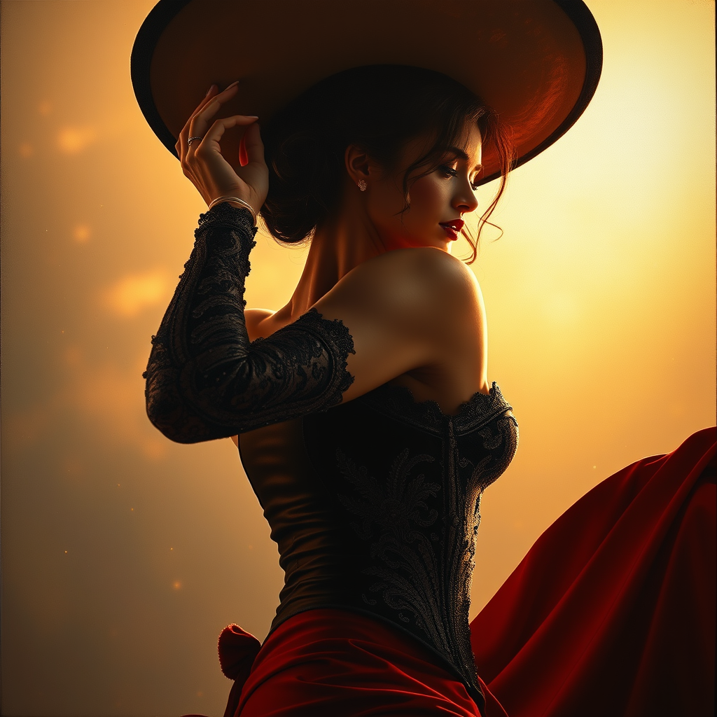 Fine arts oil painting, side angle, accent lighting, viewed from below, hyperdetailed, hyper realistic, full body portrait of a stunningly beautiful woman as a matador in form-fitting attire, infused with dynamic, intense, raw emotion, vivid cinematic color grading, photorealistic, inspired by corrida, captivating, painted in the style of Mark Keathley, featuring rich, epic action. This work captures a cinematic essence reminiscent of James Jean and Jean-Honoré Fragonard, accentuated by delicate shadows and dappled light of a peaceful, golden morning. The composition highlights the harmony between the powerful presence of the matador and the soft allure of an idyllic setting, amidst a pastel background with touches of warm sunlight and morning dew, evoking a serene ambiance with exceptional detail.