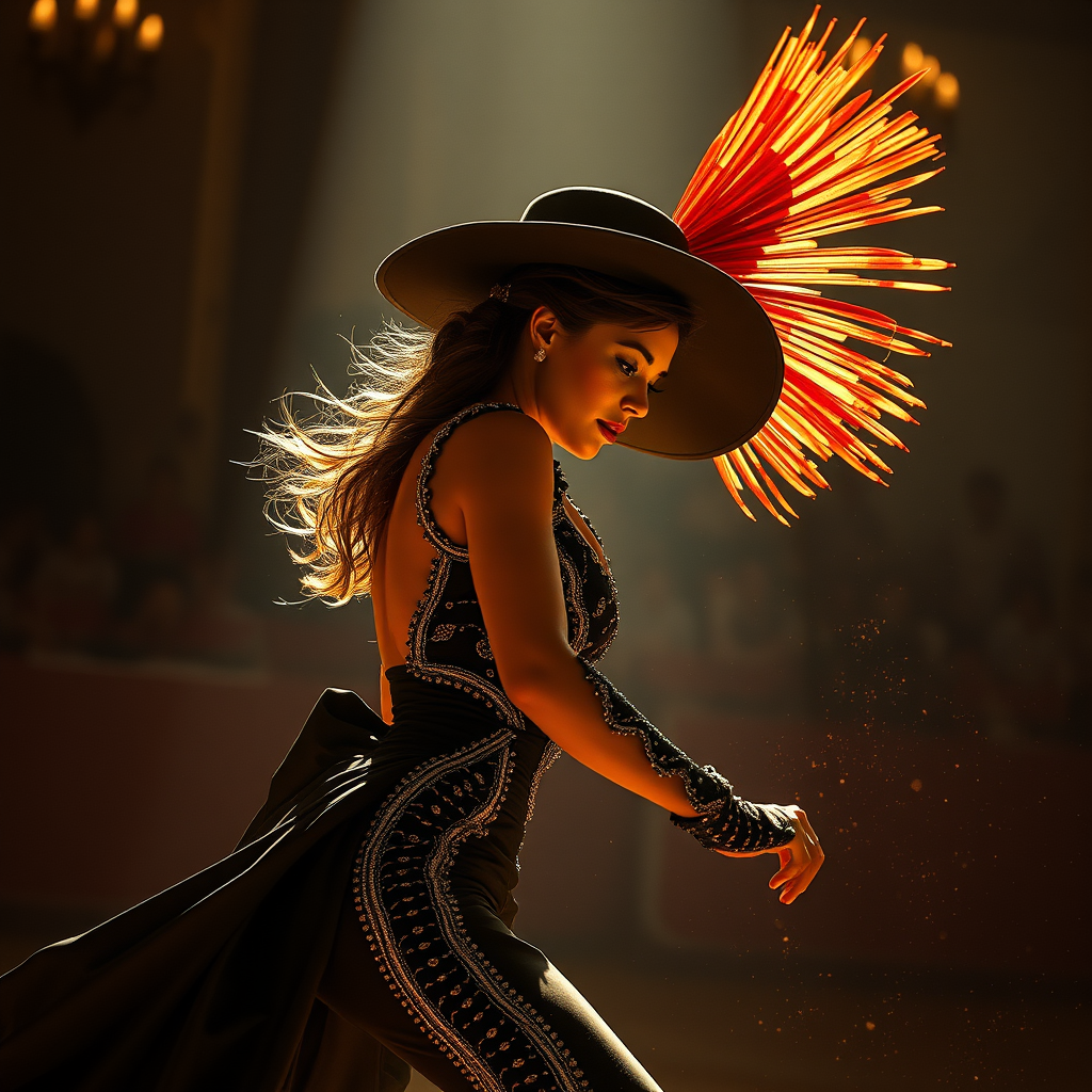 Fine arts oil painting, side angle, accent lighting, from below, hyperdetailed, hyper-realistic, epic action full-body portrait of a stunning, beautiful woman as a matador in sleek attire, dramatic movement, dynamic and intense emotion, rich, cinematic color palette, breathtaking, photorealistic, 8k quality, inspired by the style of corrida. This scene is captured with the precision of a Canon EOS-1D X Mark III, and the artistry of Mark Keathley, resembling a Shutterstock contest winner. It mirrors the essence of an iPhone and e-video snapshot, meticulously photographed using a Fujifilm GFX 100S medium format mirrorless camera with a GF 32-64mm f/4 R LM WR lens at a focal length of 45mm. The scene is bathed in the soft glow of morning light with chosen settings: an aperture of f/5.6, ISO 200, and a shutter speed of 1/125 sec, where the warm sun casts delicate shadows, bringing depth and enchantment. Celebrating the harmony of nature and vibrant splendor, it features a serene, golden sunset, dew, and a pastel yellow background, with a cinematic 35mm feel in the style of James Jean and Jean-Honore Fragonard, incorporating subtle yet creative modifications to enhance the core essence.