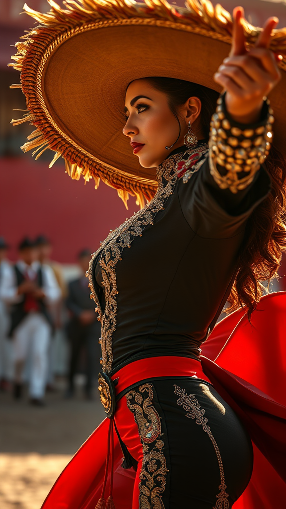 Fine arts oil painting, side angle, accent lighting from below, hyperdetailed, hyper realistic, epic action full body portrait of a stunningly beautiful woman as a matador in sleek attire, capturing a dynamic moment, brimming with raw emotion, in the style of corrida. Rich, cinematic color grading enhances the photorealistic scene, akin to a masterpiece by Mark Keathley, a Shutterstock contest winner. The image feels as if shot on a Canon EOS-1D X Mark III, but portrayed with the ultra-realism found in a painting, reminiscent of work by Thom Wasserman. The scene captures the captivating moment with exceptional detail using a Fujifilm GFX 100S medium format mirrorless camera and a GF 32-64mm f/4 R LM WR lens, set at 45mm focal length. Camera settings include an aperture of f/5.6, ISO 200, and a shutter speed of 1/125 sec, emphasizing the soft morning light. The warm sun casts delicate shadows, enriching the composition with dappled light and depth. The setting exudes peace with a golden, powder-yellow pastel background, idyllic as a scene painted in cinematic 35mm in the styles of James Jean and Jean-Honore Fragonard.