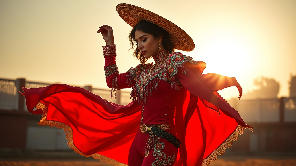 Fine arts oil painting, side angle, accent lighting from below, hyperdetailed, hyper realistic, epic action full-body portrait of a stunningly beautiful woman as a matador in tight attire. She embodies a mix of vibrant, dynamic, and raw emotion in the style of corrida, with rich, cinematic color grading. The scene is photorealistic, as if shot on a Canon EOS-1D X Mark III, evoking the mastery of a painting by Mark Keathley and carrying the finesse of a Shutterstock contest winner. The photograph combines the intricacy of a Thom Wasserman piece, taken with a Fujifilm GFX 100S medium format mirrorless camera and a GF 32-64mm f/4 R LM WR lens at 45mm focal length. The setting features soft morning light with an aperture of f/5.6, ISO 200, and a shutter speed of 1/125 sec. The warm, delicate shadows and dappled light from the morning sun add depth to the scene. The composition harmonizes nature with the vibrant splendor of a tranquil, idyllic sunrise. A powder yellow pastel background with gold and dew enhances the cinematic 35mm style reminiscent of James Jean and Jean-Honore Fragonard. Small creative modifications infuse the scene with uniqueness while retaining its core essence.