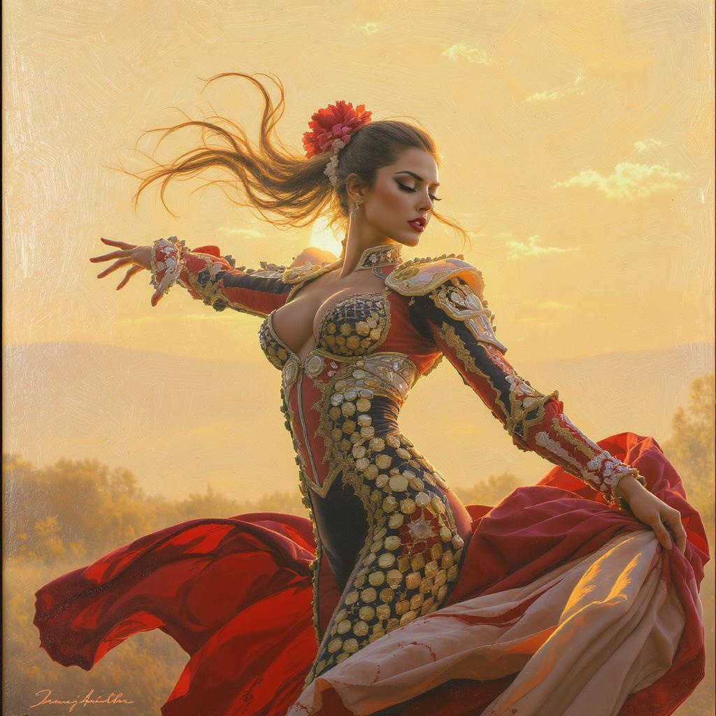 Fine arts oil painting, side angle, accent lighting, from below, hyperdetailed, hyper realistic, epic action full body portrait of a stunningly beautiful woman as a matador in form-fitting attire, dynamic and intense, capturing raw emotion, with rich, cinematic color grading. Photorealistic, reminiscent of a scene shot on high-end cameras, highlighting intricate details and exceptional clarity. The subject, with soft morning light casting delicate shadows, is enveloped in the warmth of the rising sun. The setting features a harmonious blend of nature with a serene, peaceful ambiance. A pastel background in shades of powder yellow complements the scene, lending an ethereal quality. Inspired by the styles of Mark Keathley, James Jean, and Jean-Honoré Fragonard, the composition enhances the vibrancy and allure of a moment frozen in time, celebrating both beauty and strength in a cinematic, 35mm style.