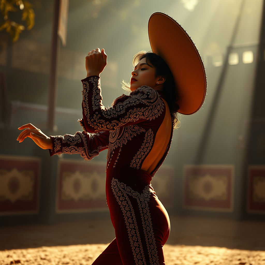 Fine arts oil painting, side angle, dramatic lighting, capturing from below, hyperdetailed and hyper-realistic, an epic action full-body portrait of a stunningly beautiful woman as a matador in form-fitting attire. The scene is infused with dynamic intensity and raw emotion, characterized by rich, cinematic color grading. The painting appears photorealistic and rendered in 8k quality, reminiscent of a shot taken on a Canon EOS-1D X Mark III. It embodies the essence of corrida, reflecting the intricacies found in a photorealistic painting by Mark Keathley. The setting conveys a seamless blend of the epic and intricate style of Thom Wasserman, as if captured with a Fujifilm GFX 100S camera with a GF 32-64mm f/4 R LM WR lens at a 45mm focal length. Camera settings emphasize the softly illuminating morning light, with an aperture of f/5.6, ISO 200, and a shutter speed of 1/125 sec. The warm morning sun casts delicate shadows and dappled light, enhancing the scene with depth and enchantment. This composition celebrates the harmony between the subject and the vibrant splendor of a tranquil, idyllic sunrise, surrounded by golden hues, gentle yellow pastels, and a cinematic 35mm style, evoking the artistry of James Jean and Jean-Honoré Fragonard.