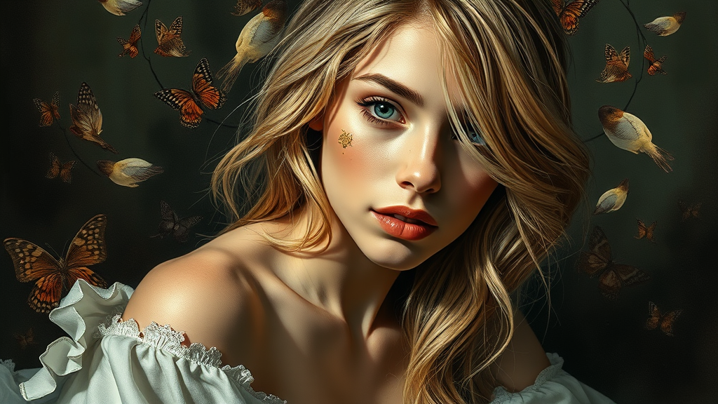 Finely detailed, dramatic composition, inspired by Rembrandt lighting, featuring a 21-year-old American white girl with blonde hair and medium breasts. Elements are portrayed in a blend of abstract art, cartoons, surrealist painting, and conceptual drawing, incorporating graphics and collage. The scene captures a mixture of elegance and dreamlike quality, with unexpected juxtaposition and imaginative twists, creating a striking visual narrative. Subtle hints at nudity and intentionally distorted proportions add a layer of complexity and intrigue.
