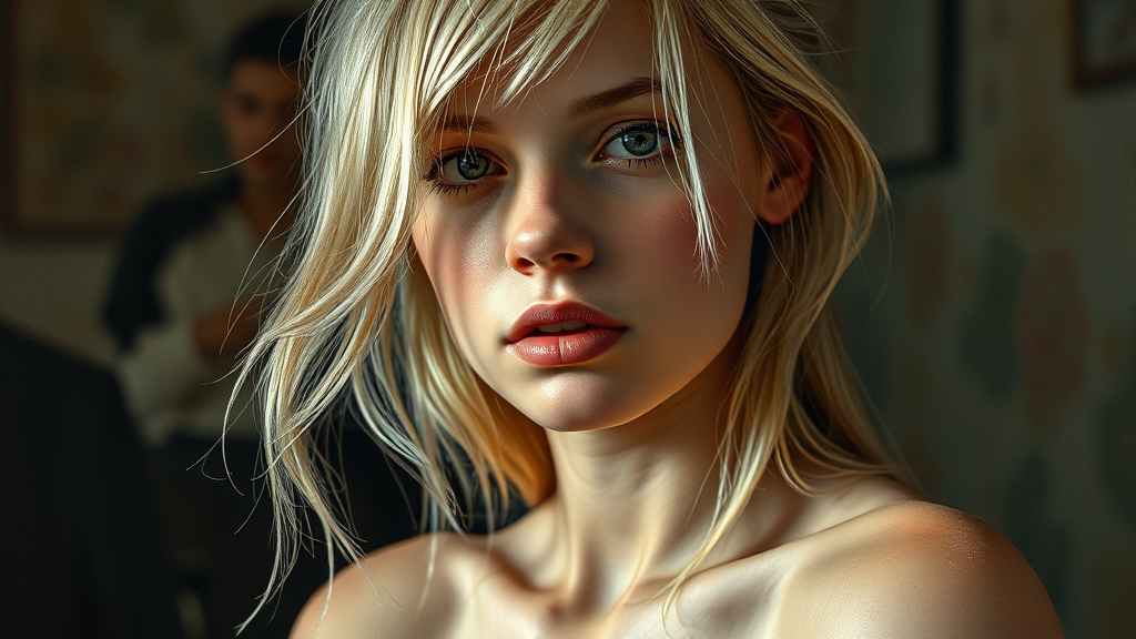 Finely detailed, quality, dramatic scene with Rembrandt lighting, featuring a 21-year-old American white girl with blonde hair, medium build, in an abstract and surrealist painting style. Incorporate elements of conceptual drawing and graphic design in a collage-like composition. Emphasize a blend of realism with cartoonish features, using ray tracing techniques to enhance texture and depth. The image should maintain an artistic exploration of proportions, integrating subtle, tasteful nudity with a focus on fine art aesthetics.