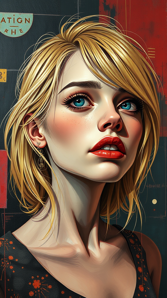 finely detailed quality surrealist painting, rembrandt lighting, dramatic, ray tracing effects, depiction of a 21-year-old American woman with blonde hair, medium build, combining abstract art and conceptual graphics, elements of cartoons and collage, transformative portrayal with exaggerated features and whimsical proportions, exploring themes of identity and expression through an imaginative, vivid scene.