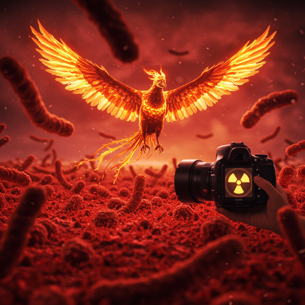 View this AI-generated image featuring flaming wings phoenix soaring amidst a prokaryotic landscape vibrant vermillion hues casting dynamic shadows a dslr capturing the scene with exquisite depth of field a singular nuclear presence glowing subtly creating a captivating blend of nature and technolog