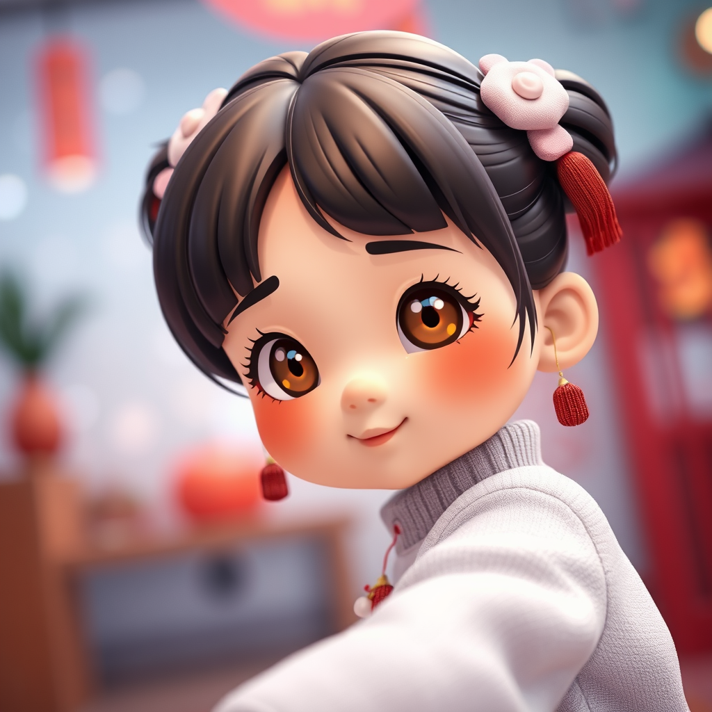 Flat illustration featuring a charming young girl, inspired by a Chinese idol, captured in a close-up 3D perspective. She has a tiny, adorable appearance, enhanced by a soft depth of field and bokeh effect. The artwork is hyper detailed, radiating a sense of fun and warmth through a composition that aligns with the golden ratio. Presented in a full-length view from a POV angle, the cartoonish style conveys a cozy and inviting atmosphere, perfect for a pastel-colored wallpaper setting.