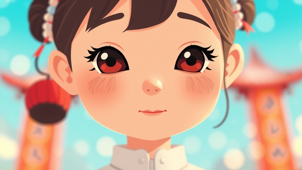 Flat illustration featuring a cute girl resembling a Chinese idol, captured in a close-up, showcasing tiny, endearing features with a 3D effect. The scene is enriched with depth of field and bokeh elements, creating a hyper-detailed and fun atmosphere. The composition follows the golden ratio, offering a full-length perspective from a point-of-view angle. The cartoon-style design provides a cozy wallpaper feel emphasized by pastel colors, with added whimsical elements for a touch of creative flair.