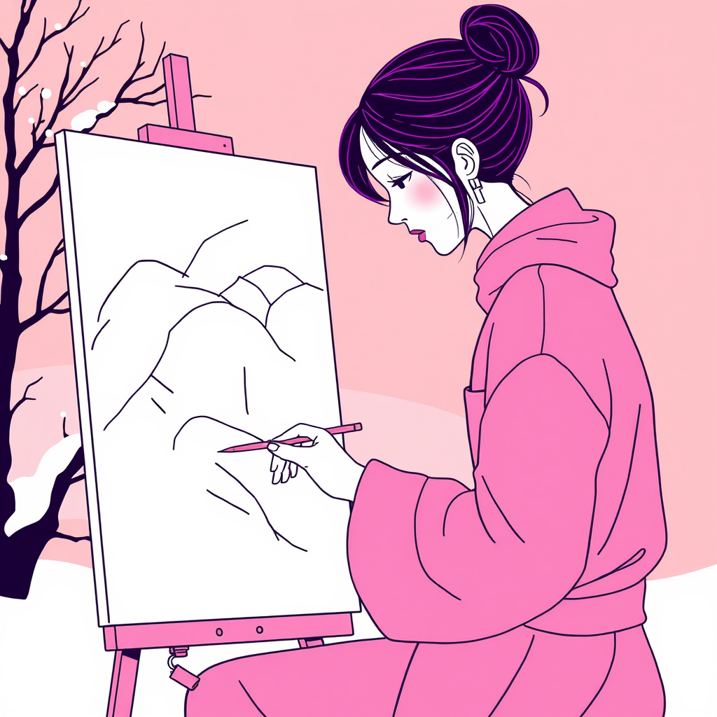 Flat illustration line art depicting types of minimalists featuring a female artist engaged in painting with influences of Tsutomu Nihei style, utilizing a purple line and pink highlights, set against a rustic winter colors backdrop.